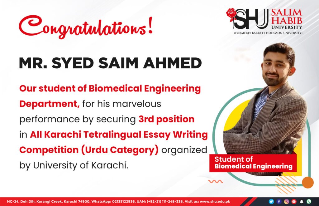 Congratulations to Mr. Syed Saim Ahmed from Biomedical Engineering Department, for his marvelous performance and for representing Salim Habib University