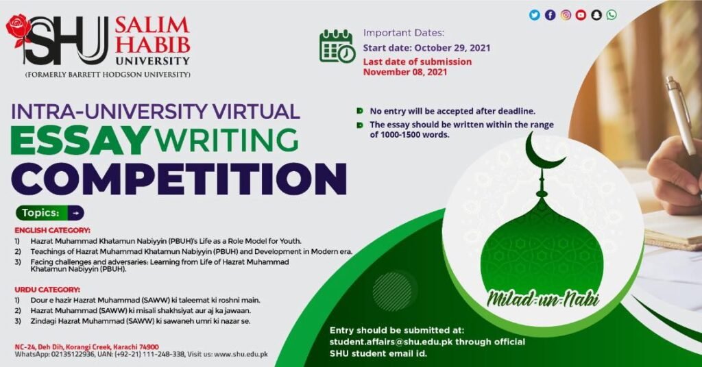 Salim Habib University is organizing Intra University Virtual Essay Writing Competition 2021 in the Holy month of Rabi ul Awwal.It's