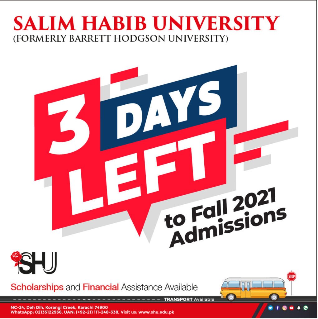 Only 3 days left to submit your Application for Fall 2021.Salim Habib University’s Admissions are Open!The Admission test for the