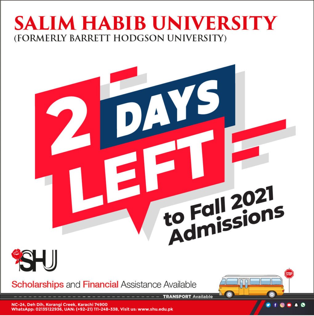 Only 2 days left to submit your Application for Fall 2021.Salim Habib University’s Admissions are Open!The Admission test for the