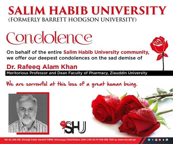 We offer our condolences on the sad demise of Meritorious Professor and Dean Faculty of Pharmacy, Ziauddin University, Dr. Rafeeq